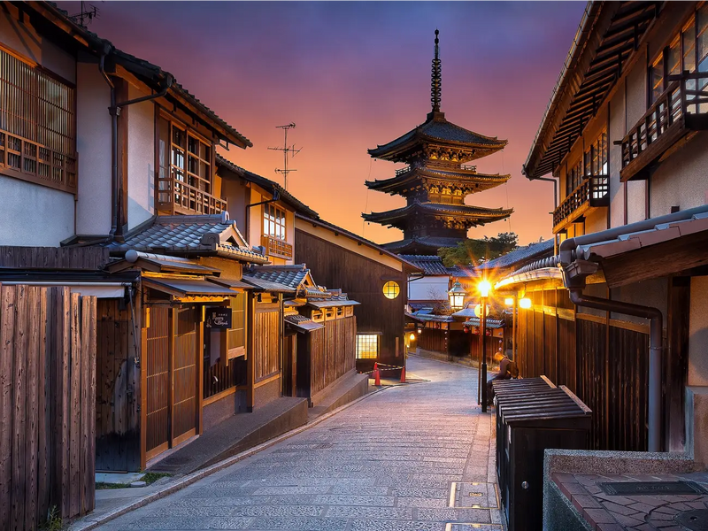 Travel to Kyoto and explore wooden streets and temple paths surrounded by cedar forest.